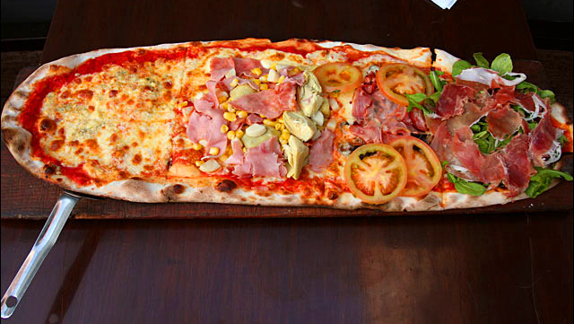 저녁에는 라이브 연주가 열리는 Bar로 바뀌는 이곳에서 우리가 주목해야할 메뉴는 바로 이 길쭉한 피자입니다.